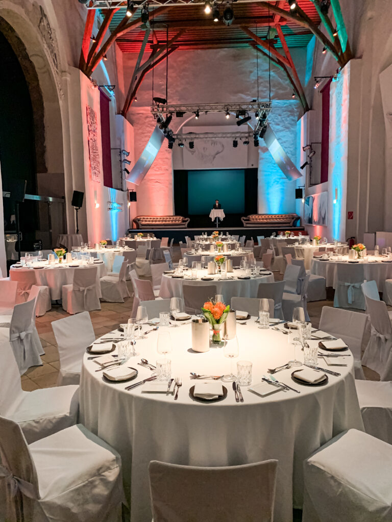 Raumgröße Kirchenschiff: 271m² (13m x 20m) Fassungsvermögen: bei Bankettbestuhlung bis zu 170 Personen Gerne bestücken wir Ihnen den Arkadenhof auch mit Stehtischen!